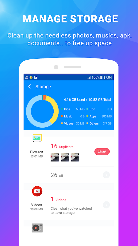 The smart memory manager will help you browse: images, videos, music, documents, etc. To increase internal storage space, delete storage space it will help you to delete duplicate files, duplicate photo delete, delete watched videos, delete useless apk files.Clean master storage space, clear up phone space and storage.