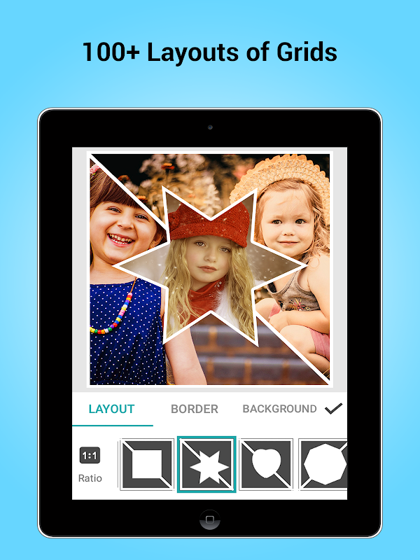 Select Photo Grid and aspect ratio. More than 50 layouts and they are organised based on the number of photographs that you wish to collage. If you select one photo then you will get beautiful PIP effects.