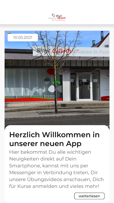 Deine Patienten erhalten so einfach und direkt wie möglich die wichtigsten News und Updates Deiner Birgit Gerlach Physiotherapie Praxis. Besondere Öffnungszeiten oder Praxisinformationen, neue Mitarbeiter, Übungen der Woche oder limitierte Praxisangebote – Deine Patienten sind mit einer eigenen digitalen Praxiszeitung stets auf dem neuesten Stand. Mit Deinem eigenen Newsfeed in Deiner App haben Deine Patienten stets die wichtigsten Informationen kompakt zusammengefasst auf ihrem Smartphone.