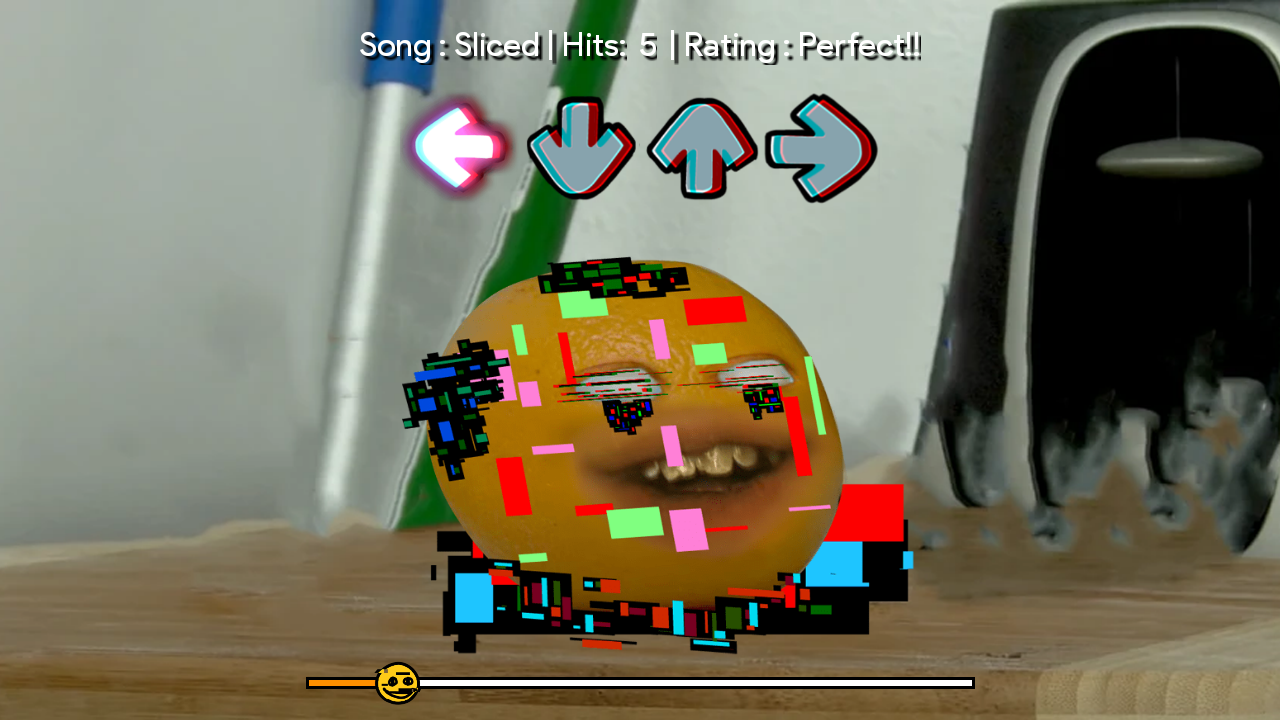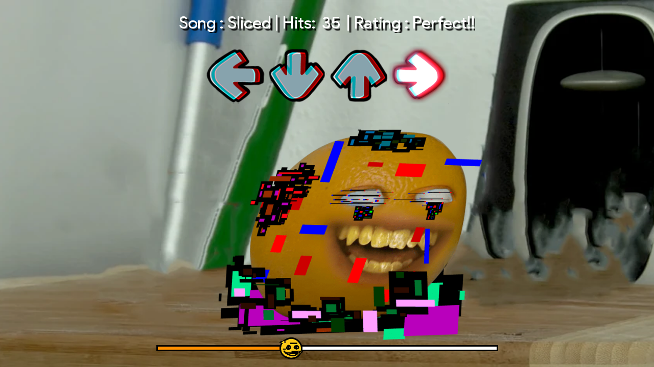 該遊戲可以完美離線運行,您可以使用四個按鈕來播放它,以使用 Pibby FNF Mod Character 的 Corrupted Annoying Orange 音樂創建您自己的獨特熱門歌曲。