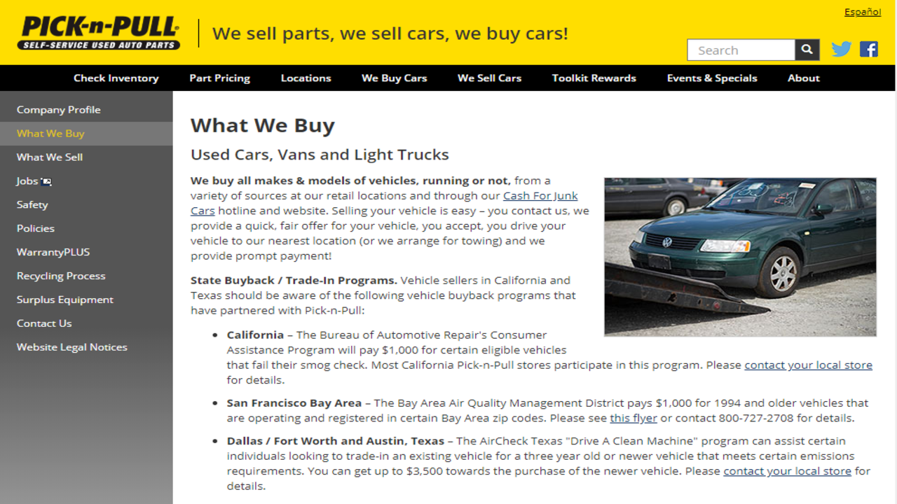 Pick-n-Pull is an industry-leading chain of self-service used auto parts stores providing recycled original equipment manufacturer (OEM) auto parts at incredible prices. For over 30 years, we have been offering quality parts for all makes and models of foreign and domestic cars, vans and light trucks. Our selection of vehicle parts is tough to beat with new arrivals daily and our stores are open 7 days a week! Finally, our shopping experience and excellent customer service set us apart from the traditional junkyard. Drop by and see for yourself.