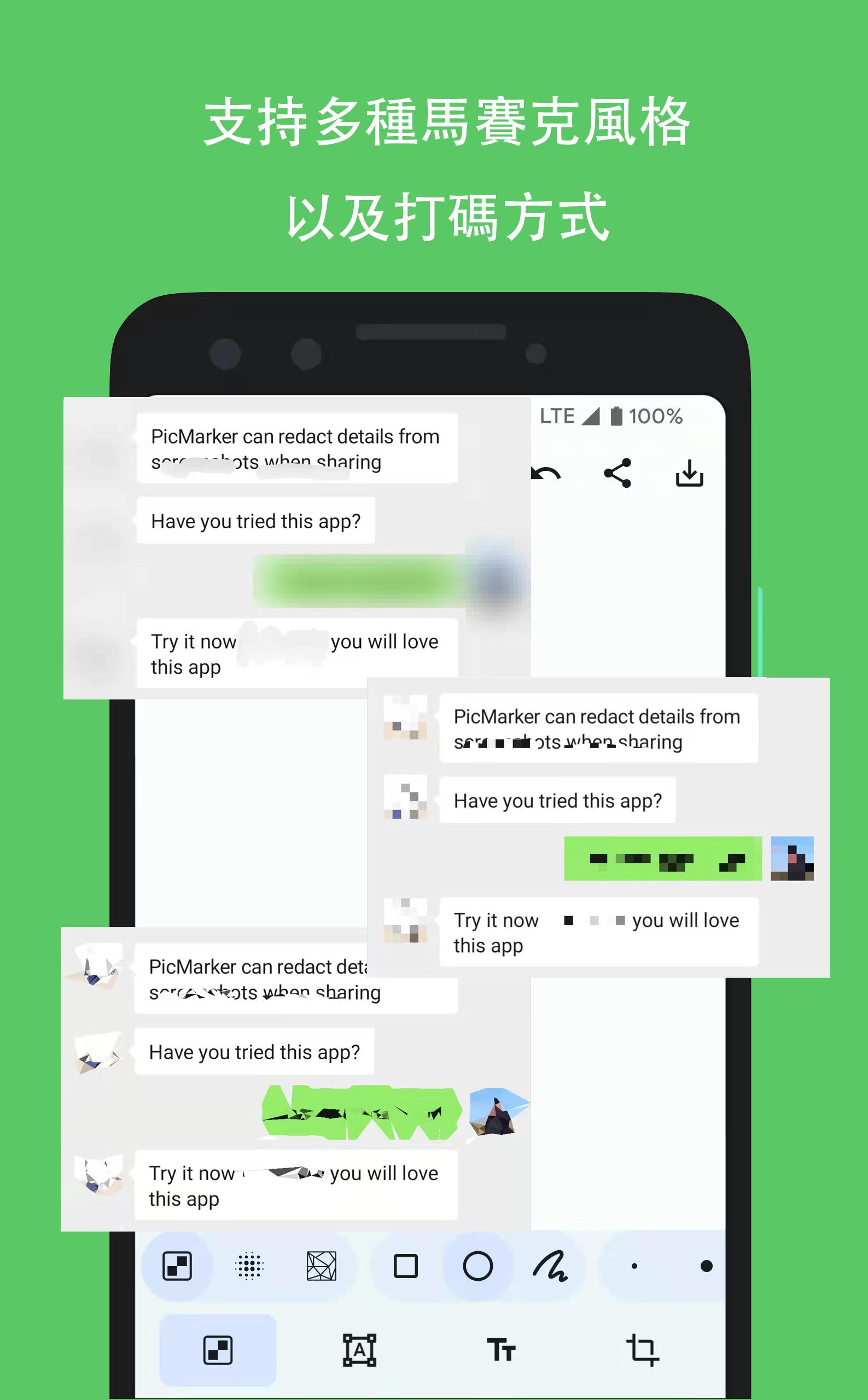PicMarker 具有多種多樣的馬塞克風格,如傳統像素馬賽克,高斯模糊風格,低多邊形,六邊形馬塞克等等,在不同的照片中使用不同風格的馬賽克類型,讓馬賽克效果顯得美觀且不突兀。