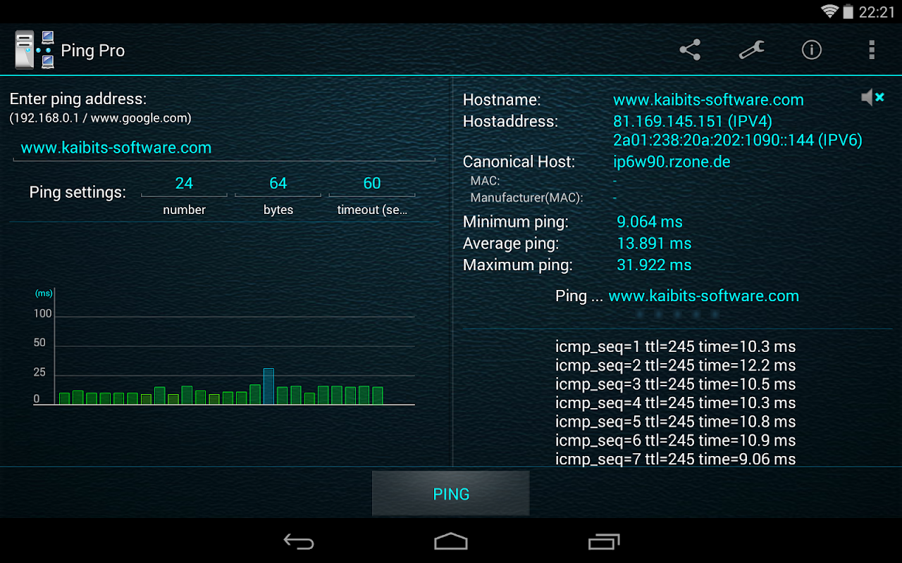 平臨措施的ICMP回顯從任何主機地址或主機名。例如,www.google.com或192.168.0.1。 PING的結果可以迅速共享為文本文件,例如雲(Dropbox的,谷歌驅動器,Evernote的...)。