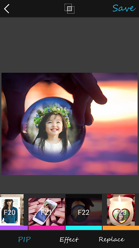 PIP Camera application allows you to maker your photo in heart, glass, love, hand, mockup phone, board and more.
