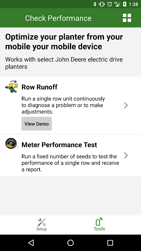 GoPlant has now become PlanterPlus™, the newest app from John Deere, combining the information from the GoPlant app to setup your planter, and the ability to perform Row Runoff and Meter Performance tests from your mobile device, to help optimize the settings on your row unit. PlanterPlus™ supports the ExactEmerge, 1775NT, 1725, DB44, DB60, DB66, DB80, DB88 DB90, and DB120 Planters, complementing the user manual to suggest initial settings for both the machine and the display and helping you connect the planter to your tractor. For select planter models (activation required, consult your local Deere Dealer), the PlanterPlus™ app will also let you perform Row Runoff and Meter Performance tests from your mobile device. Now you can start/stop tests and see real time planter stats such as population, singulation and vacuum pressure all on your mobile device. If your planter has vacuum automation, you can adjust vacuum levels from the mobile device and see how they affect singulation for your current seed.