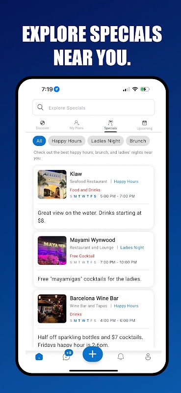 探索您附近最棒的欢乐时光、女士之夜、早午餐和其他本地特价活动。查看详情,制定计划,并立即找到与您一起共度时光的人。