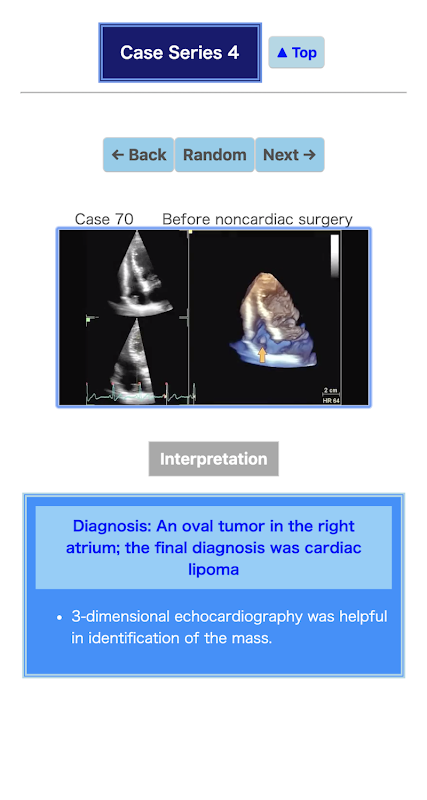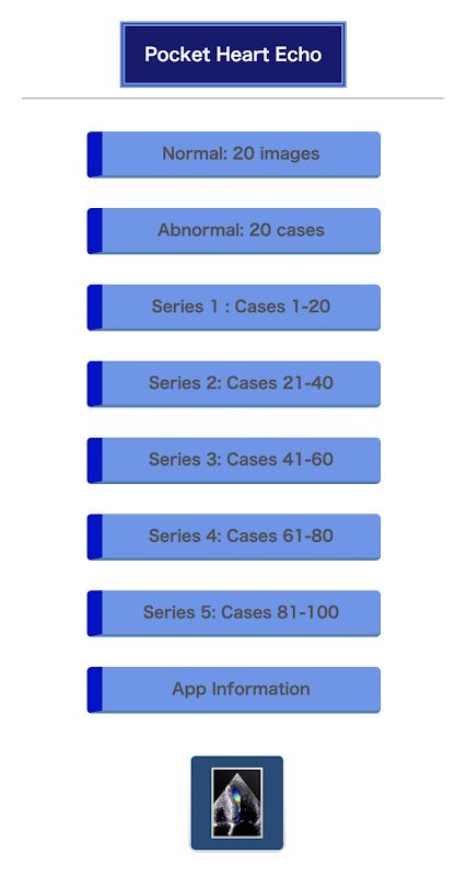 Echocardiography says, "Seeing is believing." This app is designed to display the beauty of echocardiography. More than 100 cases were selected from tens of thousands of echocardiographic examinations. All data are based on weekly echocardiographic conferences at Matsushita Memorial Hospital.