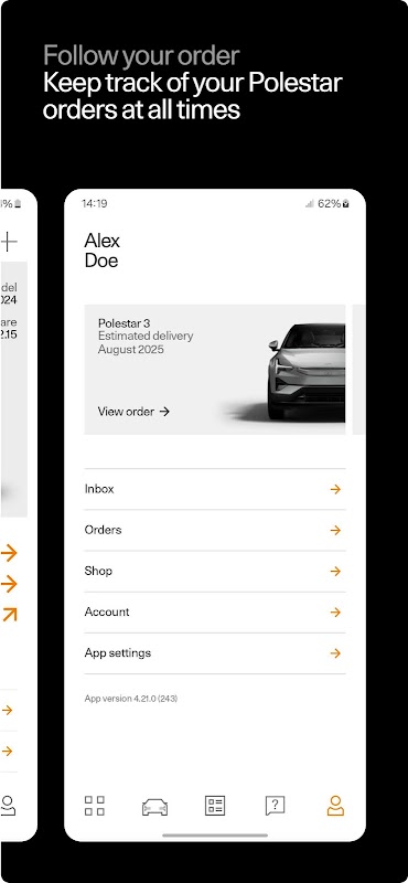查看和管理您的訂單和 Polestar ID、存取汽車配置器和附加商店,以及調整應用程式設定。