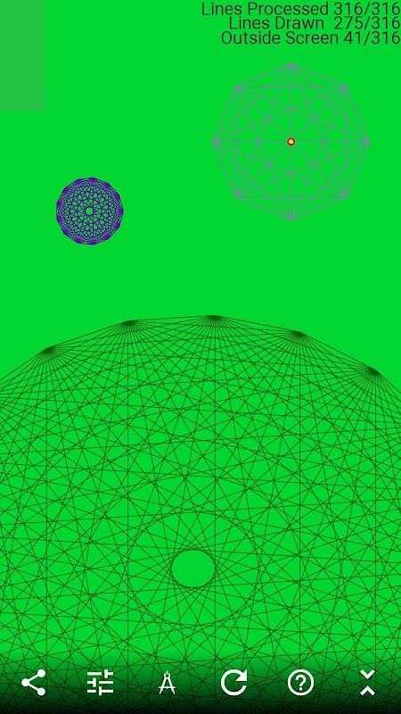 繞 3軸旋轉多邊形選擇旋轉速度,在屏幕上移動它們,調整顏色,半徑 ,以及頂點數。您還可以觀察任何多邊形的不同構造模式。