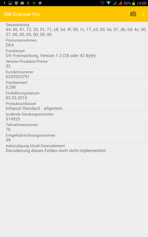 “ Post DataMatrix Scanner PRO”應用程序(https://play.google.com/store/apps/details?id=de.jprior.DataMatrixScanner.pro)可以解碼所有郵寄類型以及高級地址ID。