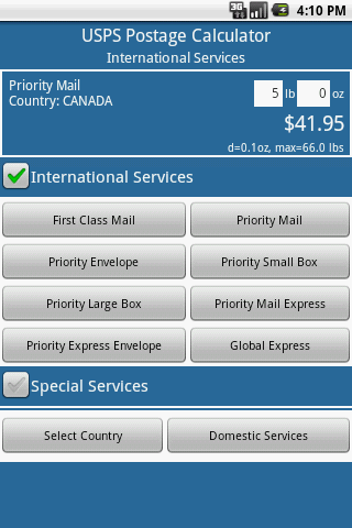 - Calculates postage for almost ALL USPS services with rates effective April 10, 2016