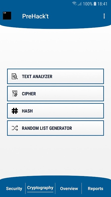 PreHack't,黑客工具箱,是專門從事網絡安全四個主要結構域劃分的應用程序: