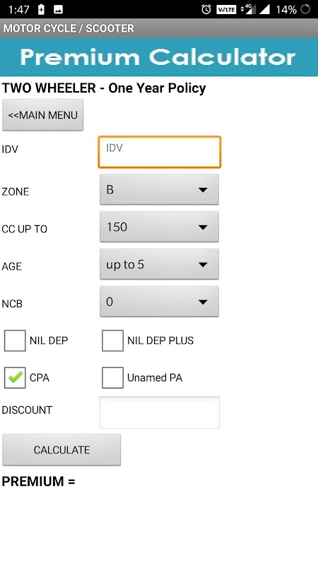 一般保險高級計算器與馬達,Mediclaim和火災保險。