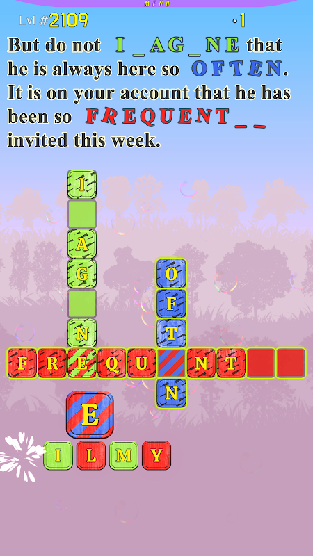 在每個級別,您都會看到故事中的一個部分,其中缺少一些單詞,您可以通過解決文本下方的填字遊戲來填寫這些部分。您填寫的每個字母都會出現在文本本身中。我們使遊戲非常易於控制,只需在填字遊戲下方的每個字母上輕觸一下即可。所有的單詞都以獨特的顏色著色,填字遊戲外的字母也被著色,玩家需要通過按單詞中正確的順序觸摸字母來將字母填充成單詞。玩家觸摸的每個字母都會直接跳到相同顏色的單詞中第一個可用的位置。如果字母在錯誤的地方,它會標有一個會閃爍的黃點。玩家可以很容易地糾正錯誤位置的字母,通過觸摸它,它會跳到外面,然後玩家應該觸摸屬於單詞中下一個空閒位置的正確字母。屬於兩個單詞的字母用斜線標記,顏色來自兩個單詞。當用戶觸摸這樣的字母時,它會直接跳到正確的位置。