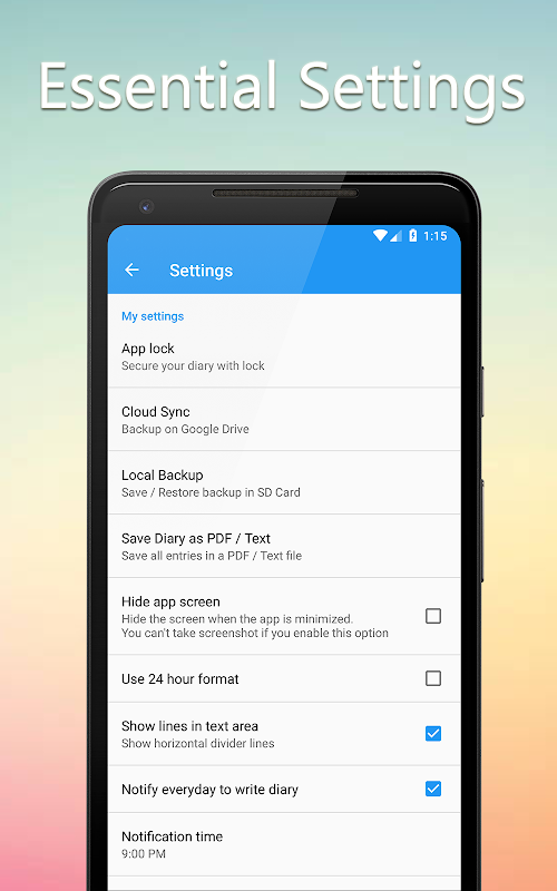 Private Journal comes with inbuild lock containing pin/password/pattern & fingerprint lock options. You can always be safe of the journal you write in it. With backup & restore feature you can never lose the data when you migrate to other devices. Colorful themes & night mode is present to make the app customizable to your taste.