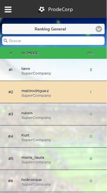 ProdeCorp es una aplicación privada y personalizada de la empresa para ser utlizada por sus integrantes, donde juegan y participan todos juntos del mundial a través de un de prode, sumando puntos, compitiendo en rankings individuales y grupales, ganando premios e intercambiando comentarios en la tribuna!