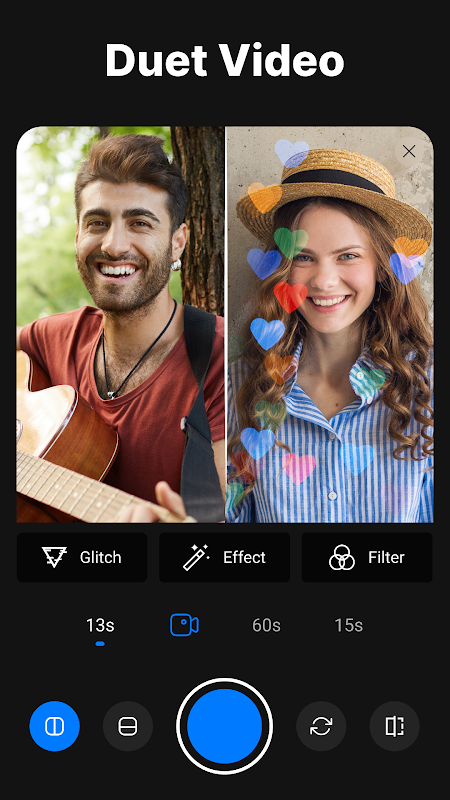 在這個免費的影片編輯器應用程式中,內建了「Duet Video」選項。影片編輯器應用程式中的「二重奏影片」通常是指將兩個單獨的影片片段組合成分螢幕或並排示範的影片組合。電影製作者或視頻創作者和編輯者允許觀眾同時觀看兩個視頻,通常會產生協作或比較效果。