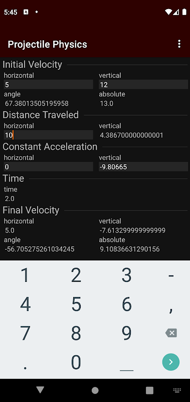 此方案解決了距離,加速度,時間,初始和最終速度。所有方程實時解決,讓您快速切換側重於不同方面的模型之間。