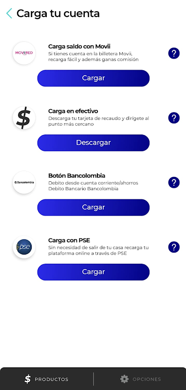 Métodos para cargar la cuenta a través de los QR's de Bancolombia, Nequi y daviplata.