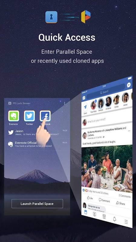 PS Lock Screen是一個與平行空間完美配合的鎖屏工具,您只需點擊通知既可快速訪問平行空間或最近使用的克隆應用程式。與此同時,PS Lock Screen可以區分來自克隆應用和原始應用程式的消息與通知,幫助您更好的區分管理消息。