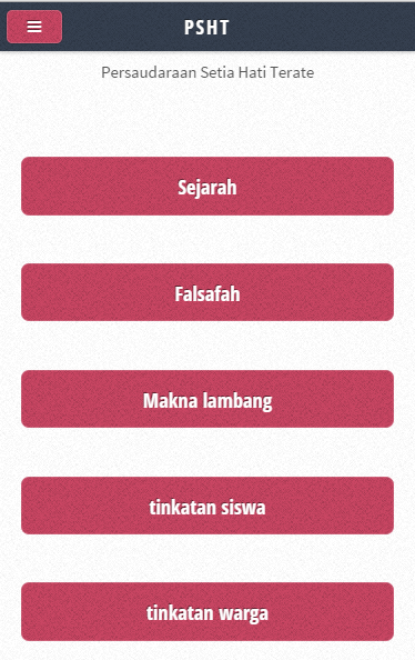 Dalam aplikasi ini deberikan informasi sedikit tentang PSHT dimana anda dapat mengetahui sejarah berdirinya psht , tingkatan siswa, warga, filsafat dan semboyan yang kadang kita sendiri lupa akan hal itu, dikarnakan kita telah menjadi keluarga besar PSHT. disini kami membuka kritik dan saran yang sifatnya membangun khususnya buat aplikasi ini mau pun untuk organisasi kita yaitu PSHT tercinta. sedikit kami tekankan bahwa aplikasi ini berusaha memperkenalkan Persaudaraan Setia Hati Terate ke masyarakat luas atau pun internasional melalu dunia maya.