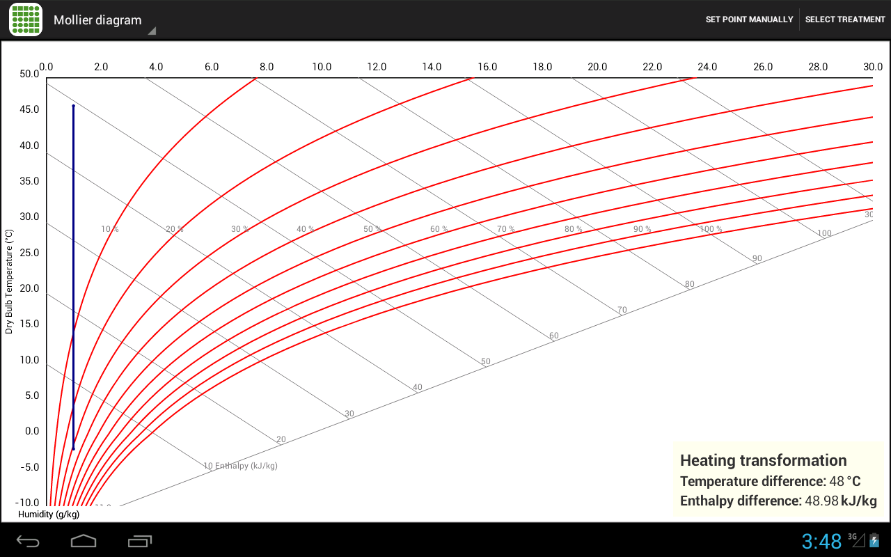Free psychrometric utility App, very useful for all HVAC producer. By tapping once on the chart, it lets you calculate the Air Specific Humidity, Relative Humidity and Enthalpy of a specific point. Instead if you drag a point to another, it lets you calculate air treatments like Heating, Cooling, Humidification and Steam Humidification.