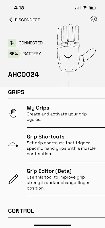 該電話應用程序可以通過藍牙連接到PSYONIC Ability Hand。用戶可以使用該應用程序選擇輸入控制系統,配置直接控制電極設置,配置壓力感應系統,配置自定義用戶手柄以及無線更新手的固件。