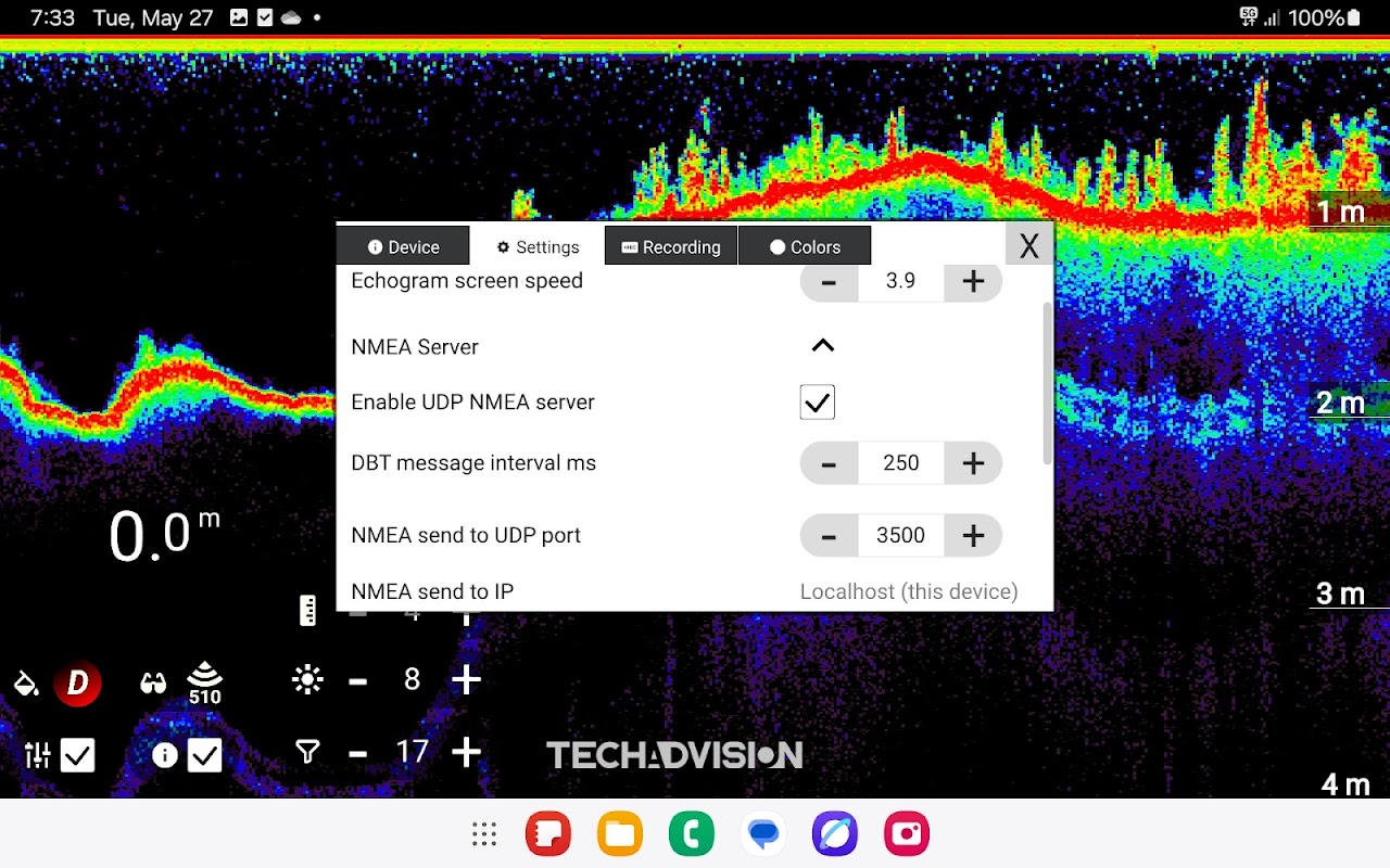 NMEA 伺服器允許 DBT 和 MTW 訊息傳輸到其他應用程序,補償換能器安裝深度,啟動迴聲圖記錄和回放,深入了解調色板的含義等等,這些都作為附加設定和功能提供。