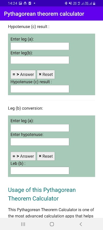 要使用此應用程序,您只需插入 a 或 b 邊或斜邊 (c),然後點擊計算按鈕。一旦您點擊答案按鈕,這個畢達哥拉斯定理計算器就會返回最終答案。