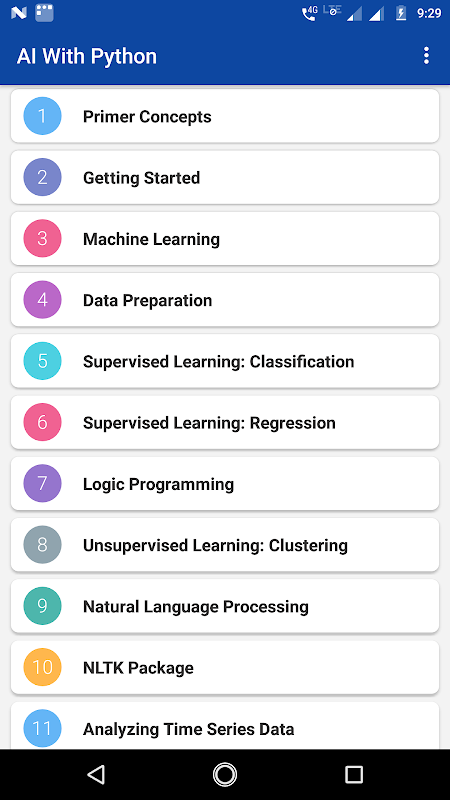 Artificial intelligence is the intelligence demonstrated by machines, in contrast to the intelligence displayed by humans. This app covers the basic concepts of various fields of artificial intelligence like Artificial Neural Networks, Natural Language Processing, Machine Learning, Deep Learning, Genetic algorithms etc., and its implementation in Python.