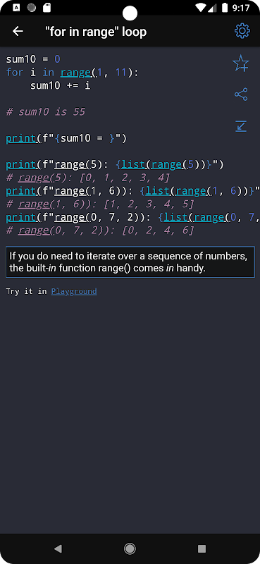 • 應用程式中的所有範例均可離線使用。當網路連線不可用時可以使用該應用程式。