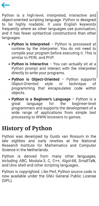 Python 教程應用程序涵蓋以下主題:-