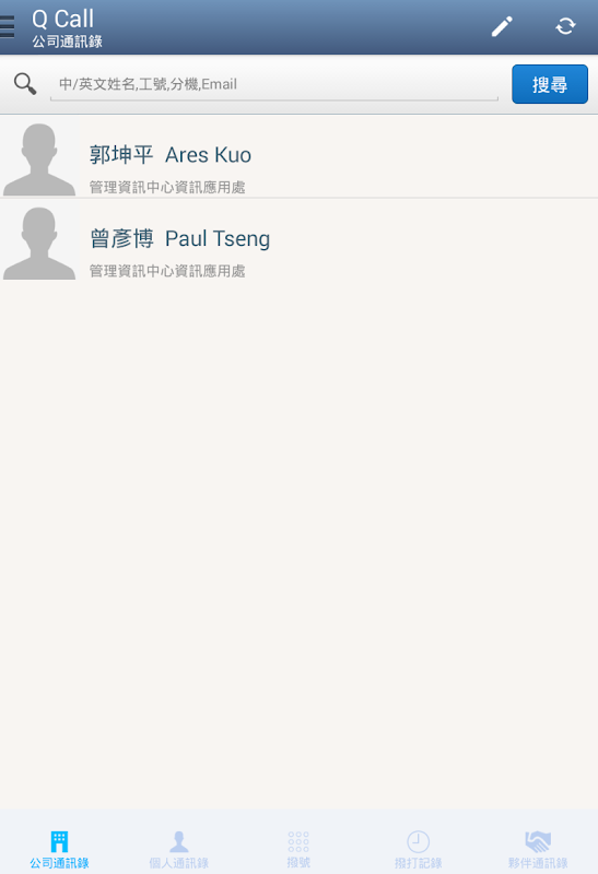 1. 公司通訊錄:搭配模糊搜尋,可快速查詢公司內各個人員資料,快速撥打或進行各項連絡。