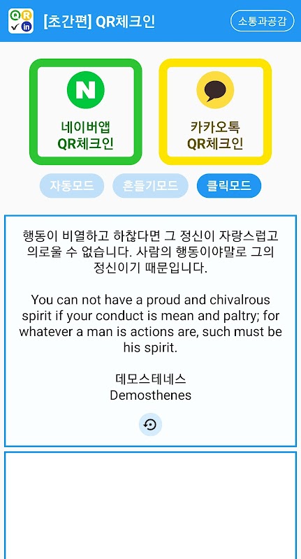 ⚽ 클릭모드 : 앱 실행 후 클릭할 때 QR체크인(전자출입증)이 생성/노출 됩니다.