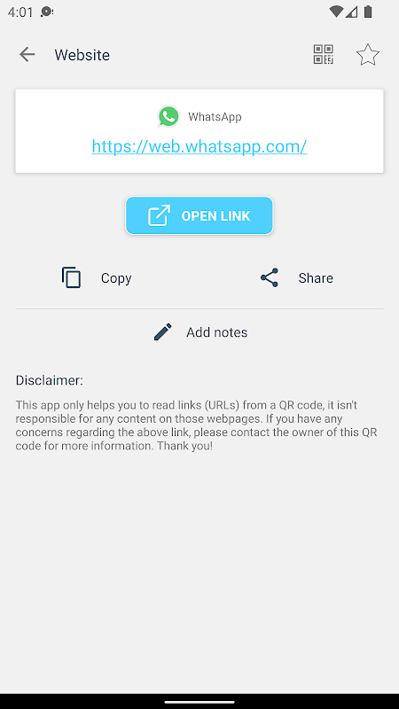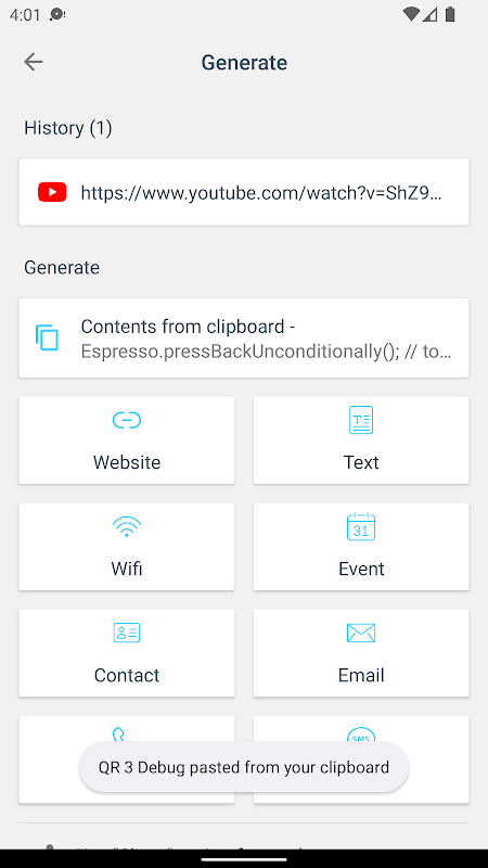 The app itself is also a QR code generator app allowing you to generate QR code in different types such as website URL, text, contact, phone number, SMS, wifi, calendar event...
