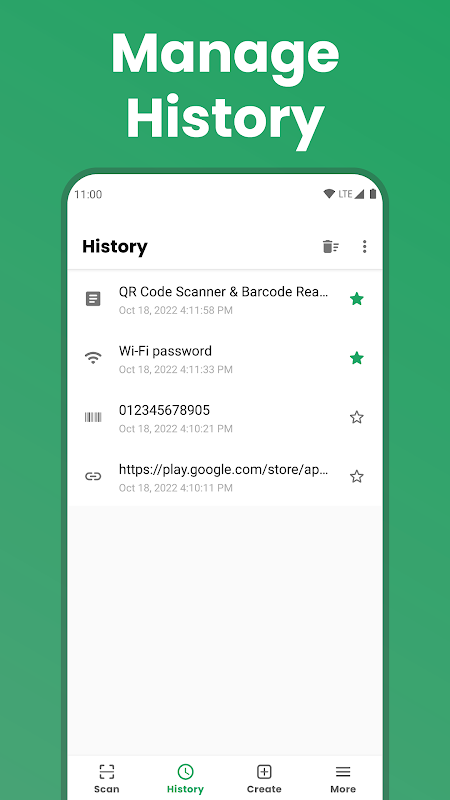 With the barcode scanner & qr reader app, you have full control over your data. Add a scan item to the favorites, clear the history or even disable the history feature manually.