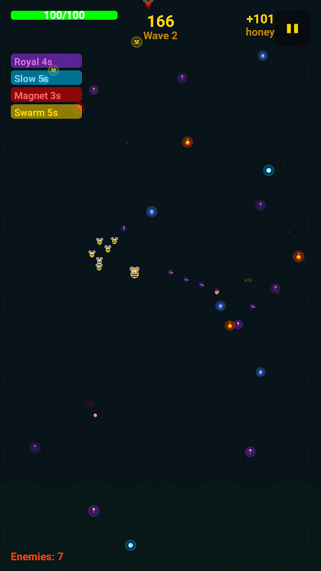 隨著遊戲進程的推進,敵人的攻擊力會越來越強。新的敵人類型會出現,生成頻率會提高,每個敵人的攻擊力都會增強。在蜂巢陷落之前,你的蜂后能走多遠?