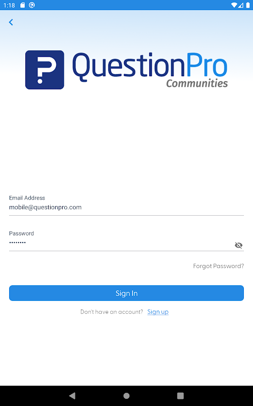 運行 OS v4.1 及更高版本的 Android 手機和平板電腦支持此版本的 QuestionPro 社區應用程序。使用我們的應用程序很簡單,只需輸入您註冊的電子郵件地址和密碼的組合以及您的 QuestionPro 社區的訪問代碼。