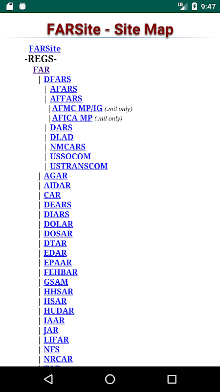 如果您在線,該應用程序確實能夠訪問其他一些 .mil 和 .gov 網站,因此在使用此應用程序搜索關鍵字和次要關鍵字時,請務必記住這一點。由於這些功能的大小和可訪問性,完整政府網站的某些鏈接和功能將無法按預期工作。但是,如果您的設備允許應用程序訪問互聯網,那麼您通常可以訪問這些資源。當您離開 FAR 應用程序時,您將收到一條警告,因為瀏覽網頁的功能已無縫集成到 QuickFAR 中。