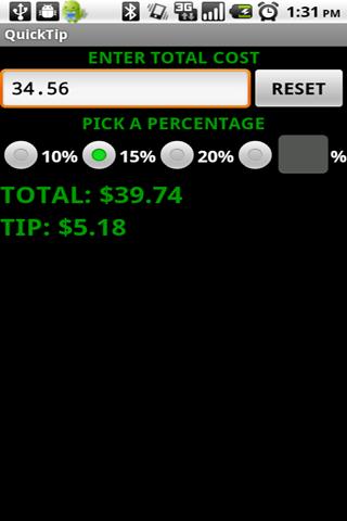 This application is a simple, fast and efficient tip calculator. Just enter the amount owed and it will automatically give you the tip and total owed with a fifteen percent tip. Or you can pick ten percent, twenty percent or enter any percent you like. This application is also great for calculating discounts at the store or any other percent problem.