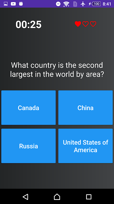 Quiz Plus - General Knowledge Quiz is a free App where in each question you are given 30 seconds to answer questions. Each question has 4 options, out of which only one is correct. Each correct answer will give you one point and each incorrect answer will deduct one life. You are given 3 lives, if you answer one question incorrectly then your one life is deducted and if 3 answers are answered incorrectly, then the game is over, you will be shown your score. At then end of the quiz you are shown your scorecard with correct, incorrect and total question answered.
