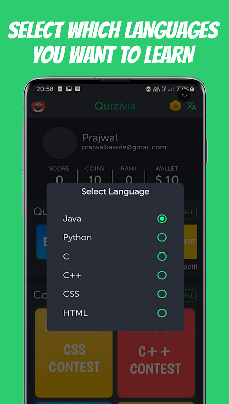 在 Quizivia,您可以學習計算機語言,如 Java、Python、Html、CSS、C++
