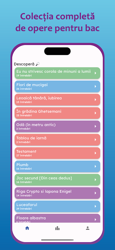 以互動方式完成測驗,輕鬆學習羅馬尼亞語考試的 BAC 科目。超過 500 個測驗將幫助您以互動方式確定您對可能無法通過學士學位的作品的了解。利用從問題中學到的信息,您將能夠撰寫一篇論文,通過該論文您將在考試中獲得最高分。