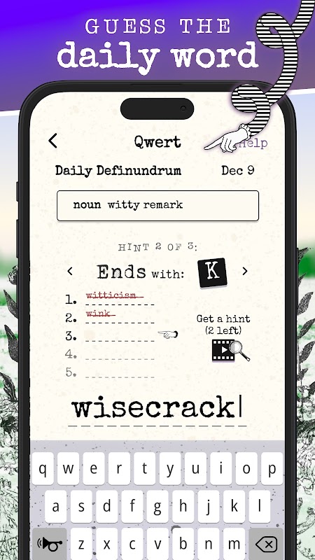 Qwert 結合了經典文字遊戲和快速打字遊戲的最佳功能,並將它們融入獨特且具有挑戰性的體驗中!透過不同的遊戲模式保持你的拇指靈活。在 Time Attack 中快速思考並想出盡可能多的單詞,或者在 Wordplay 中放慢滾動速度,得分最高的單詞獲勝。需要從比賽中休息一下嗎?在單人生存迷你遊戲 Splat 中智勝蜂群,並消滅討厭的飛信!在我們最新的遊戲 Daily Definundrum 中,每天僅根據其定義和一些提示來猜測一個新單字 - 這就像單字書呆子的 Wordle!