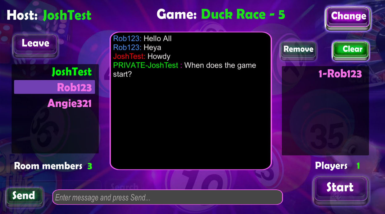 Raffingo 是一個功能齊全的託管系統。通過私人和公共聊天。包括“將玩家添加到遊戲”、“分配玩家編號”、“刪除玩家”、“開始遊戲”、“清除玩家”、“更改遊戲”等功能。