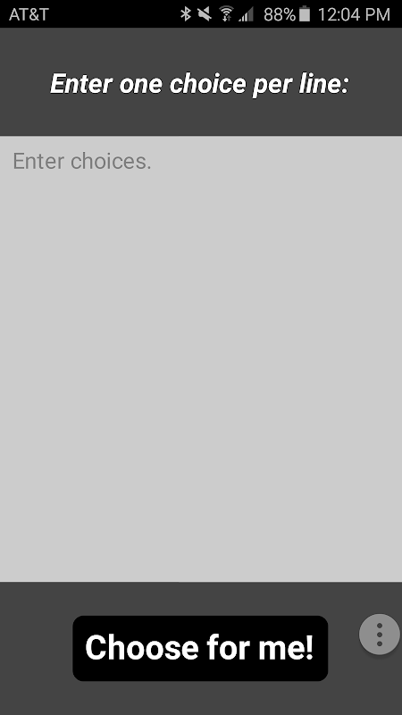 Can't decide what restaurant to go to? Arguing over which movie to watch? Use this simple app to help you make decisions. You can enter as many options as you want and hit the "Choose for me!" button to get a completely random selection from your list.