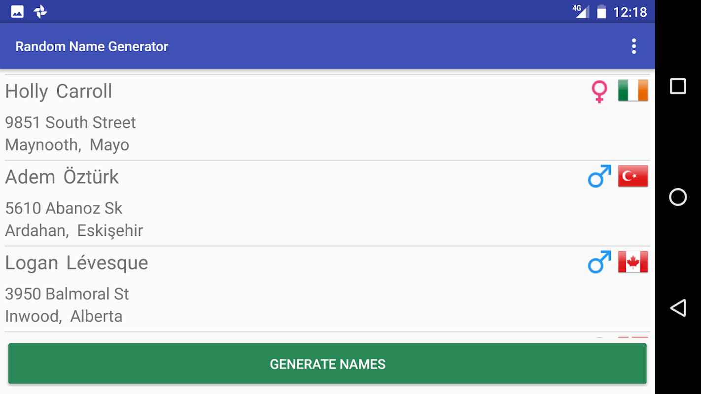 這種隨機名稱生成將創建一個從許多不同國籍的隨機名稱和地址。您也可以選擇生成的名字的性別和名字複製到Android剪貼板。