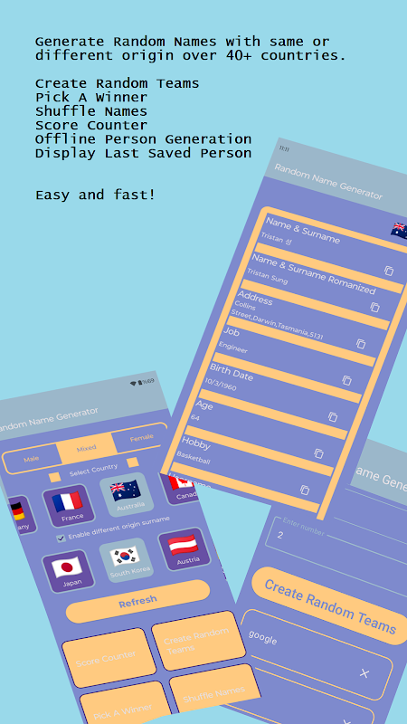 隨機名稱產生器,選擇器可以用作假人生成器,洗牌,選擇獲勝者,創建團隊。儲存並稍後使用。甚至支援離線模式。