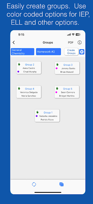 The Edit Student screen now has up to four customizable learner characteristics such as IEP and ELL which are color coded and will be shown on the group screen. This will allow the option for more purposeful grouping of students. There is now a heterogeneous group option which will place students in different groups when possible.