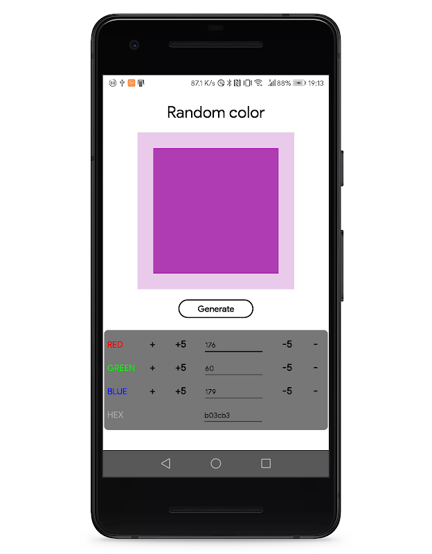 - get a random color with the amounts of red, green and blue, and HEX code.